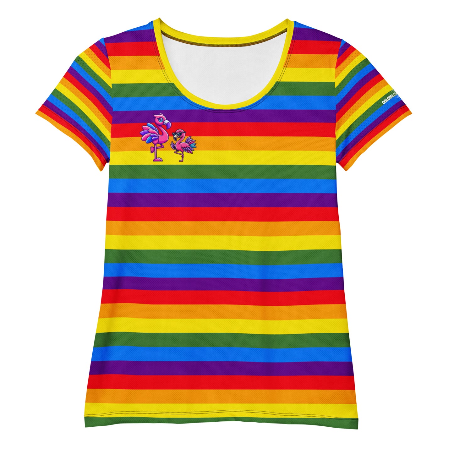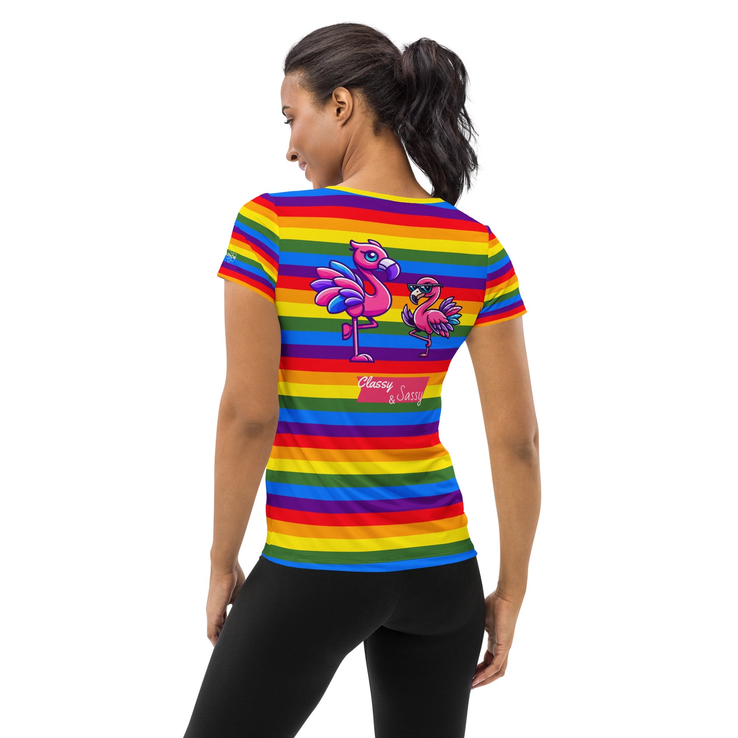 Franny Classy & Sassy Flamingo Rainbow Stripes Athletic T-Shirt (Women's Cut)