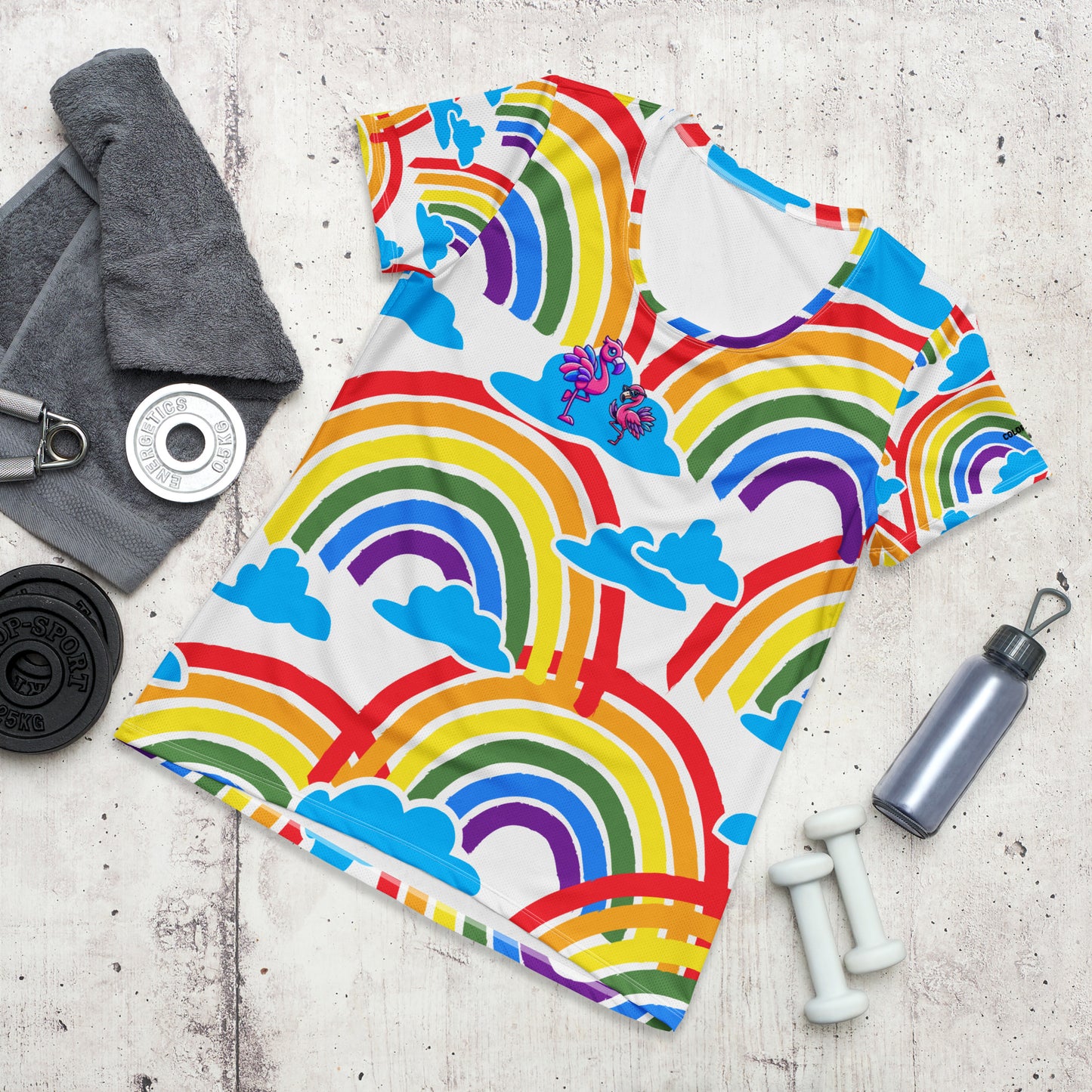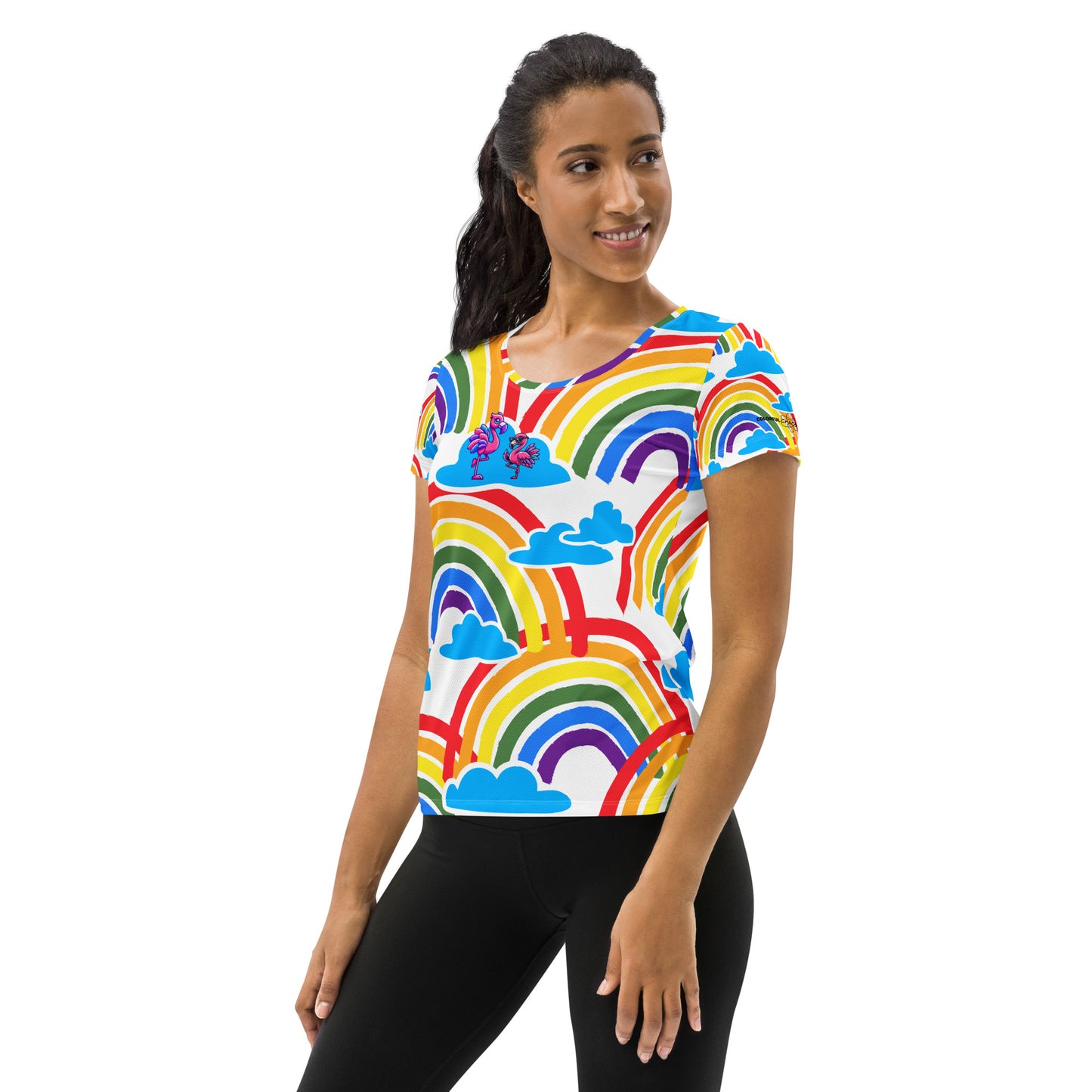 Franny Classy & Sassy Flamingo Rainbow Clouds Athletic T-Shirt (Women's Cut)