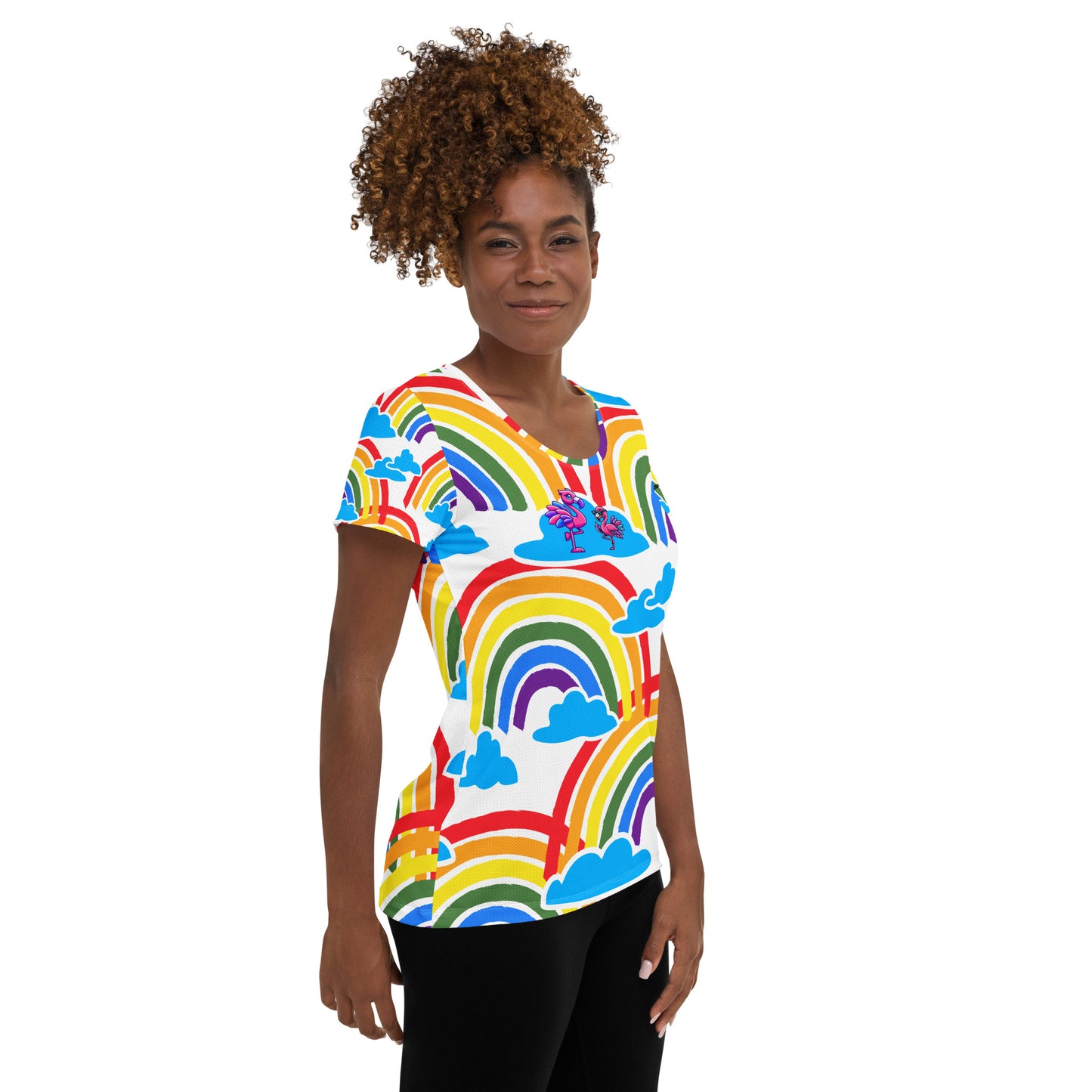 Take your workouts and pride looks to the next level with the Franny Classy Sassy Rainbow Clouds Athletic T-Shirt (Women's Cut). Designed for both performance and style, this shirt combines breathable sports mesh with a vibrant rainbow cloud design that makes a bold statement wherever you go.