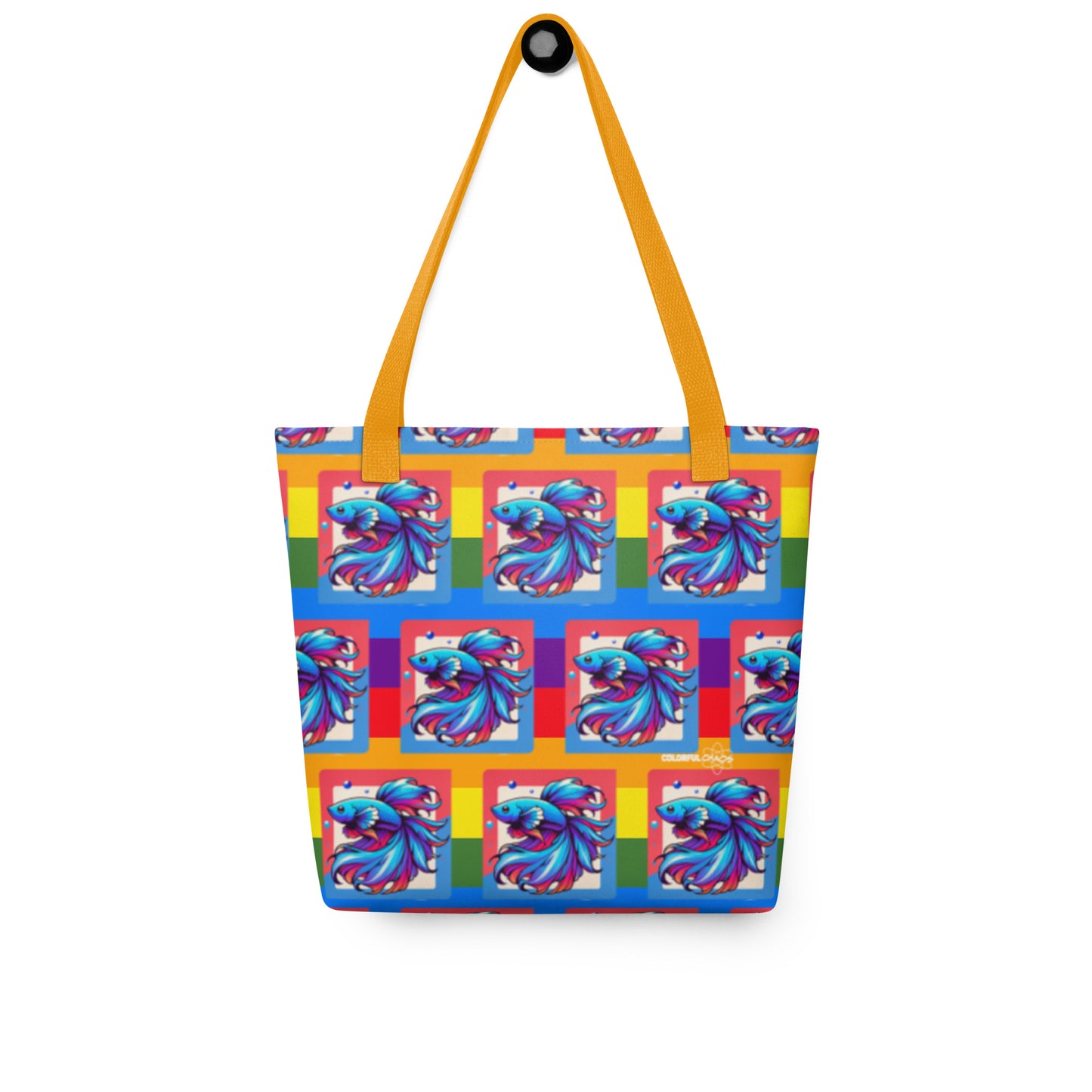 Make a splash with the Nova the Betta Repeating Pride Stripes Be Bold Tote Bag – a vibrant and functional accessory inspired by the beauty of the betta fish and the boldness of Pride. Whether you’re heading to a Pride parade, the farmers’ market, or the beach, this tote adds a burst of color and personality to your day.